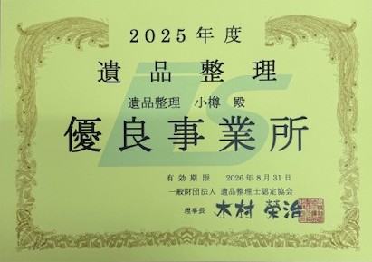 一般社団法人遺品整理士認定協会より【感謝状】・【優良事業所】の認定を受けました
